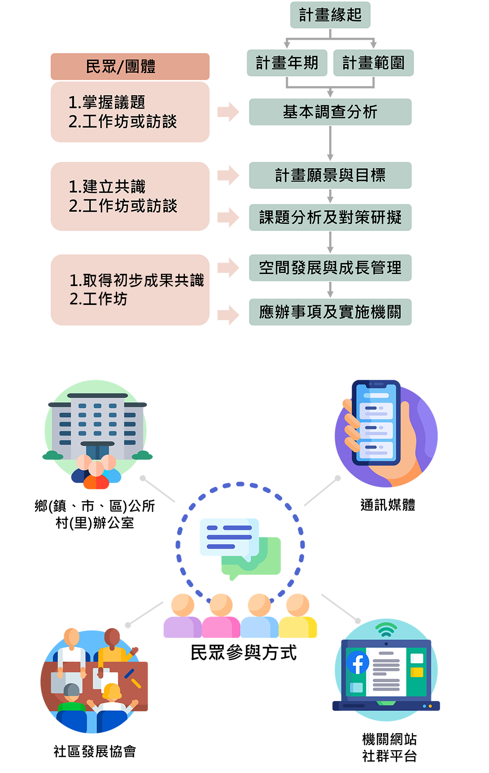為落實上位計畫及部門政策,以及回饋鄉村地區真正生活上的需要,其規劃作業過程應由直轄市、縣(市)政府及鄉(鎮、市、區)公所協同各該目的事業主管機關帶領該地區居民共同參與,建立溝通平台,進行一系列開放性對話。