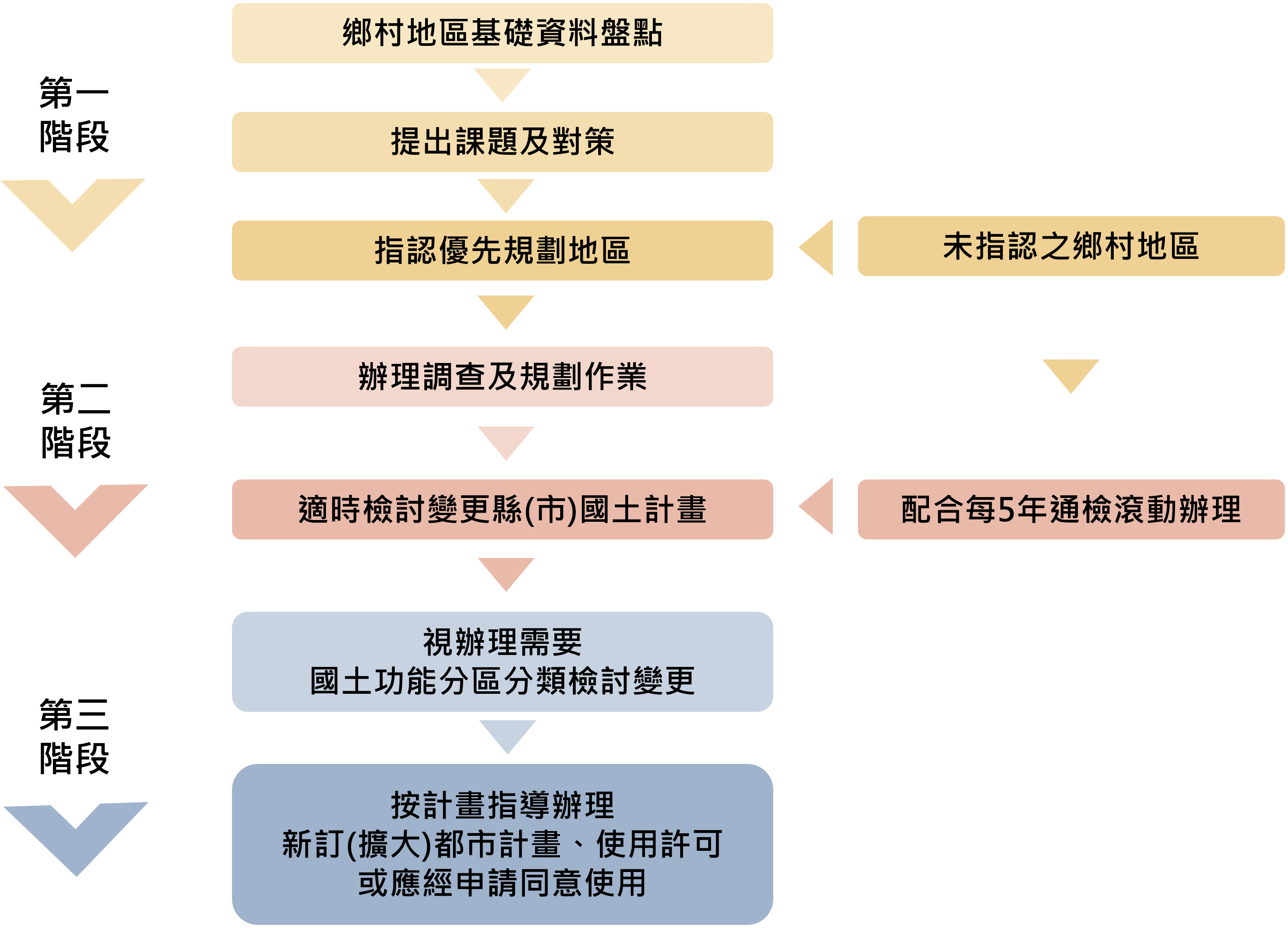 全國國土計畫指名直轄市、縣(市)國土計畫應「研訂鄉村地區整體規劃」,即鄉村地區整體規劃係屬直轄市、縣(市)國土計畫應表明事項。然考量直轄市、縣(市)國土計畫應載明事項甚多,又具辦理時效性,如就鄉村地區進行基本調查及整體規劃,恐無法於法定期限內完成,經108年1月22日內政部國土計畫審議會第4次會議討論後,將鄉村地區整體規劃區分成3個階段推動。
